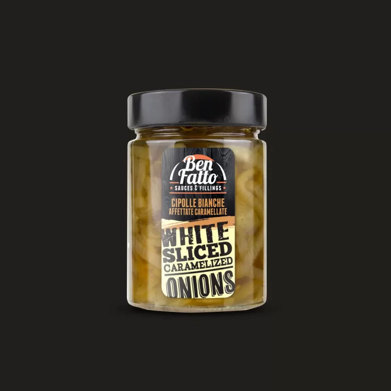 Le Cipolle Bianche Caramellate sono un passe-partout in cucina e al barbecue. Morbide, ambrate e ricche di sapore, sono pronte per arricchire qualsiasi piatto di carne.